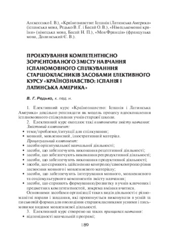 - Редько, Валерій Григорович (2016) Designing competence-oriented content of learning for training Hispanic communication by means of the elective course "Country Studies: Spain and Countries of Latin America" In: Анотовані результати науково-дослідної роботи Інституту педагогіки НАПН України за 2016 рік . Інститут педагогіки НАПН України, м. Київ, Україна, pp. 189-191. ISBN 978-966-644-398-5