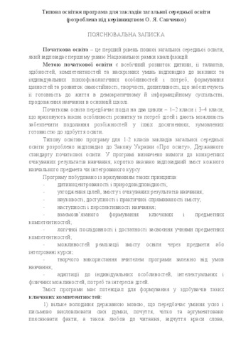 - Савченко, Олександра Яківна, Бібік, Н.М., Онопрієнко, Оксана Володимирівна, Мартиненко, Валентина Олександрівна, Пономарьова, К. І., Прищепа, О.Ю., Вашуленко, Оксана Вікторівна, Листопад, Наталія Петрівна, Андрусенко, Ірина Володимирівна, Комаровська, О.А., Остапенко, О.І., Коршевнюк, Т. В., Мачача, Тетяна Святославівна, Скворцова, С.О. and Гайдамака, Олена Василівна (2018) A typical educational program for institutions of general secondary education (developed under the guidance of O.Ya. Savchenko) [Teaching Resource]