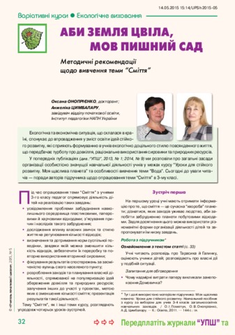 - Онопрієнко, Оксана Володимирівна and Цимбалару, Анжеліка Дмитрівна (2015) Let the earth bloom like a lush garden. Methodological recommendations for studying the theme "Garbage" Elementary school teacher, 5. pp. 32-35.