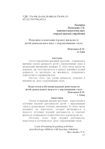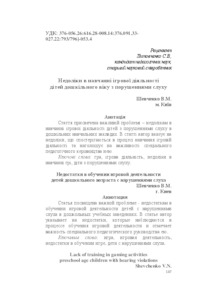 - Шевченко, В.М. (2011) Deficiencies in learning the game activities of preschool children with hearing impairments Education for persons with special needs: paths of development (2). pp. 187-195. ISSN 2313-4011