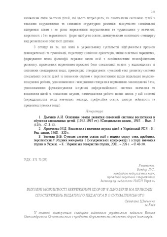- Шевченко, Світлана Миколаївна (2011) Educational opportunities to preserve the health of schoolchildren on the example of the observations of an outstanding teacher V. A. Sukhomlinsky A child with sensory impairments: development, training, education (2). pp. 241-247. ISSN 2313-4542