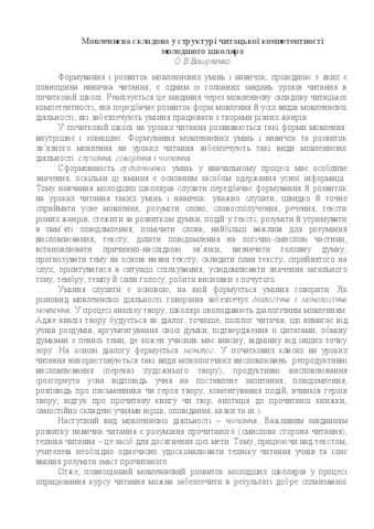 - Вашуленко, Оксана Вікторівна (2012) Speech component in the structure of reader competence younger student In: Annotated results of scientific research work of the Institute of Pedagogics for 2011 . Педагогічна думка, м. Київ, Україна, pp. 326-327.