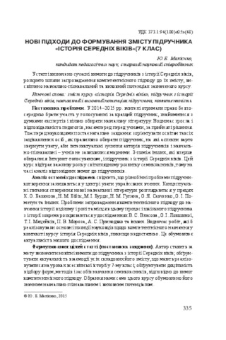- Малієнко, Юлія Борисівна (2015) New approaches to the design of the content of a textbook «History of Middle Ages» (the 7th grade) Проблеми сучасного підручника, 1 (15). pp. 335-344. ISSN 2411-1309