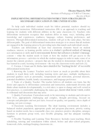 - Shparyk, O.M. (2017) Implementing Differentiated Instruction Strategies In Secondary Education In The United States In: Педагогічна компаративістика і міжнародна освіта – 2017: освітні трансформації у контексті європейської інтеграції і глобалізації: збірник тез доповідей І Міжнародної наук.-практ. конференції . Педагогічна думка, м. Київ, Україна, pp. 204-207.
