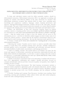 The thesis is devoted to the problem of implementing the differentiation of education in US school education. In secondary education in the United States teachers differentiate instruction through a variety of different ways: flexible grouping, learning centers, independent study, adjusting questions, choice activities.