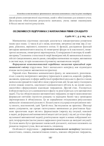 - Бурда, Михайло Іванович (2018) Features of the mathematics textbooks (standart level) In: Анотовані результати науково-дослідної роботи Інституту педагогіки за 2018 рік.