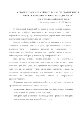 - Тименко, Марія Миколаївна (orcid.org/0000-0002-7639-5630) (2016) Methods of career guidance and education of secondary school students of England In: Педагогічна компаративістика – 2016: освітні реформи та інновації у глобалізованому світі: матеріали наук.-практ семінару (Київ, 6 червня 2016 р.) . Педагогічна думка, м. Київ, Україна, pp. 115-116.