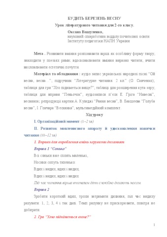 - Вашуленко, Оксана Вікторівна (2016) March wakes a spring. Lesson on literary reading for the 2nd grade Учитель початкової школи, 2. pp. 20-23.