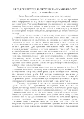 - Семко, Лариса Петрівна (2013) Methodological approaches to the study of computer science in the 5th grade of the basic school In: Анотовані результати науково-дослідної роботи Інституту педагогіки за 2013 рік . Педагогічна думка, м. Київ, Україна, pp. 150-151. ISBN 978-966-644-398-5