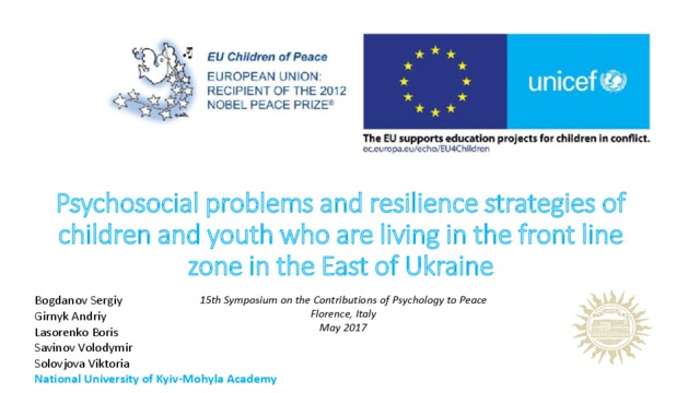 In the presentation of the report, carried out by dr. Sergiy Bogdanov on May 25, 2017 at the 15th Symposium on the Contributions of Psychology to Peace (Florence, Italy), describes the conditions, procedure and main results of one of the first systematic studies of the psychosocial problems of children and youth that live in a buffer zone of a military conflict in eastern Ukraine. It is shown that the information obtained in the study can become the basis for conceptualizing of a culture of specific resilience, as well as the platform for planning further competent psychosocial interventions in order to increase the effectiveness of overcoming the sadness and stress by the younger generations of Ukrainians who were directly affected by the military aggression of the Russian Federation in Ukraine.
