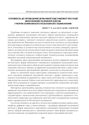- Лукіна, Т.О. (orcid.org/0000-0002-3802-6666) (2018) Readiness for the state final certification of graduates of the basic school in the form of external independent assessment In: Анотовані результати науково-дослідної роботи Інституту педагогіки НАПН України за 2018 рік . Педагогічна думка, м. Київ, Україна, p. 237. ISBN 978-966-644-464-9
