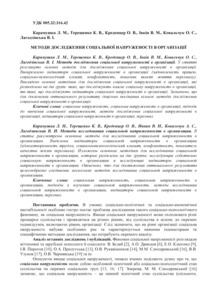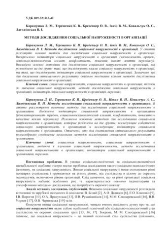 - Івкін, В.М., Карамушка, Л.М., Терещенко, К.В., Креденцер, О.В., Ковальчук, О.С. and Лагодзінська, В.І. (2016) Methods of studying social tension in the organization Організаційна психологія. Економічна психологія, 4 (7). pp. 75-83. ISSN 2411–3190