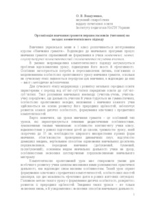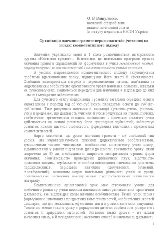 - Вашуленко, Оксана Вікторівна (2017) The organization of literacy training of the first-grader pupils based on a competency-based approach. Початкова освіта: портрет випускника початкової школи, розроблений відповідно до структури освітніх результатів на компетентнісній основі; методичні рекомендації МОН України щодо організації навчально-виховного процесу в 2017/2018 навчальному році. pp. 21-28.