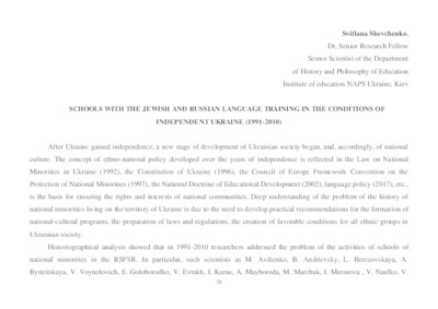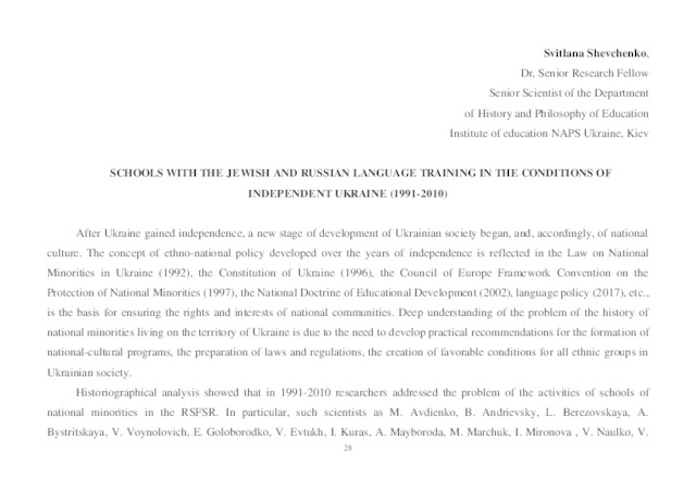 - Shevchenko, Svetlana (2018) Schools with the jewish and russian language training in the conditions of independent Ukraine (1991-2010) In: III Міжнародна науково-практична конференція «Пріорітети наукових досліджень: теоретична та практична цінність» 27-30 листопада 2018 р., Новий Сонч, Польща . ПП Лисенко, м. Київ, Україна, pp. 28-29.