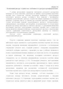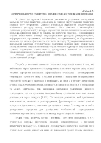 - Жадан, Ірина Василівна (orcid.org/0000-0001-5274-574X) (2016) Political discourse of students: features and resources of transformation Наукові студії із соціальної та політичної психології, 1 (37(40)). pp. 82-91. ISSN 2309-8287