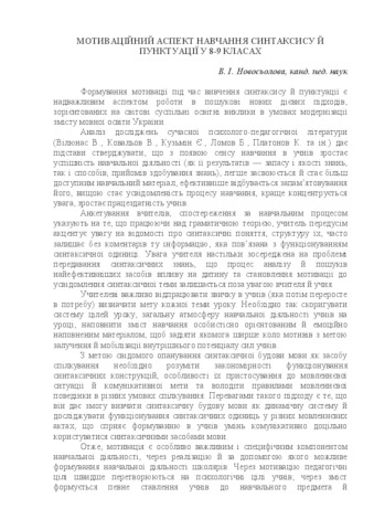 - Новосьолова, Валентина Іванівна (2016) Motivational aspect of teaching syntax and punctuation in grades 8-9 In: Анотовані результати науково-дослідної роботи Інституту педагогіки НАПН України за 2016 рік . Педагогічна думка, м. Київ, Україна, pp. 197-198.