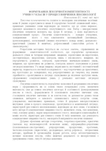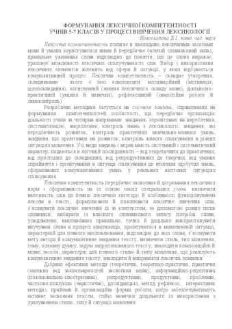 The thesis covers the topic of formation of lexical competence of students 5-7 classes in the process of studying lexicology. Effective methods are distinguished (theoretical, theoretical-practical, practical (depending on the patterns of assimilation of the language); informational-receptive (explanatory and illustrative); reproductive, productive, problem-oriented, partly-search (heuristic), research, reflection method, interactive methods); receptions and organizational forms of work that will ensure the active assimilation of lexemes, sustainable skills of expedient use, taking into account the style, type and situation of broadcasting.