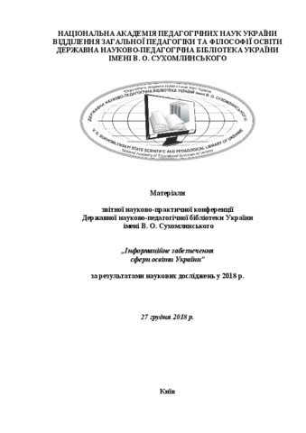 ДНПБ України ім. В. О. Сухомлинського, НАПН України (2018) Information support for education in Ukraine : scientific conference of V.O. Sukhomlynskyi SSPL of Ukraine. According to the results of scientific research in 2018 . Державна науково-педагогічна бібліотека України імені В. О. Сухомлинського, м. Київ, Україна.