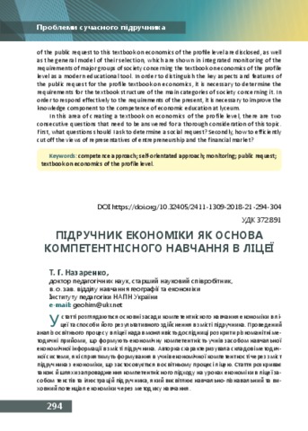 - Назаренко, Тетяна Геннадіївна (2018) Textbook as the basis of competently teaching economics at the senior school Проблеми сучасного підручника, 21. pp. 294-304. ISSN 2411-1309