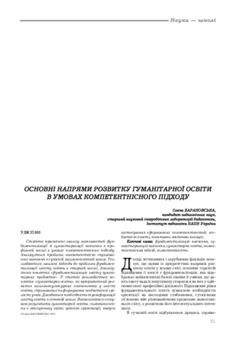 - Барановська, Олена Володимирівна (orcid.org/0000-0002-0788-8511) (2013) Basic directions of development of humanitarian education in conditions of competence approach Українська мова і література в школі, 7. pp. 51-54.