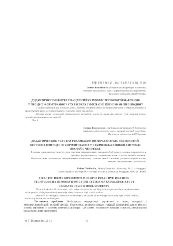 - Васьківська, Галина Олексіївна (orcid.org/0000-0002-8714-8512) (2013) Didactic terms implementation of interactive teaching technologies in formation of the system of knowledge about human in high school students Молодь і ринок, 1 (96). pp. 18-22. ISSN 2308-4634