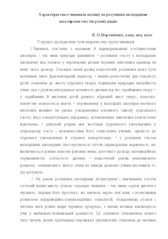 - Мартиненко, Валентина Олександрівна (2013) Characteristics of factors influencing the understanding of junior school students texts of different types In: Анотовані результати науково-дослідної роботи Інституту педагогіки НАПН України за 2013 рік . Інститут педагогіки, м. Київ, Україна, pp. 181-182.