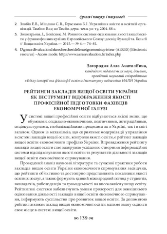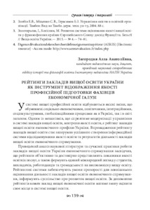 - Загородня, Алла Анатоліївна (orcid.org/0000-0003-2418-1670) (2018) Ratings of higher educational institutions of Ukraine as a tool reflecting the quality of professional training of specialists in the economic sector In: Диференціація у шкільній освіті: історичний досвід і сучасні технології: збірник матеріалів Всеукраїнської науково-практичної конференції, 16 травня 2018 р., м. Київ . Інститут педагогіки НАПН України, м. Київ, Україна, pp. 139-144.