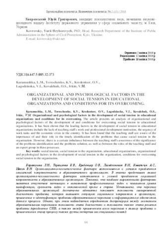 - Ivkin, V. M, Karamushka, L.M., Tereshchenko, K. V., Kredentser, O.V., Lagodzinska, V. I. and Kovalchuk, O. S. (2018) Organizational and psychological factors in the development of social tension in educational organizations and conditions for its overcoming Організаційна психологія. Економічна психологія, 2 (13). pp. 68-73. ISSN 2411–3190