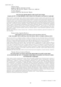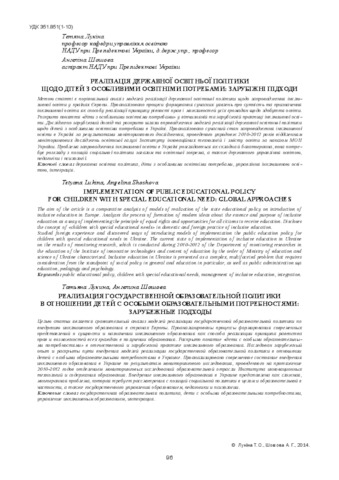 - Лукіна, Т.О. (orcid.org/0000-0002-3802-6666) and Шошова, А.Г. (2014) Implementation of public educational policy for children with special educational need: global approaches Актуальні проблеми державного управління, 3. pp. 96-101.