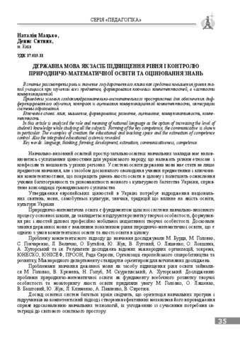- Мацько, Наталія Денисівна and Ситник, Денис Валерійович (2014) National language as an option of increasing the level and control of natural and mathematical education and knowledge assessment Педагогічні інновації: ідеї, реалії, перспективи, 1. pp. 35-41. ISSN 2413-4139