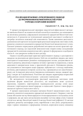 - Коршевнюк, Т. В. (orcid.org/0000-0003-0430-5808) (2018) Realization of the practice-oriented approach to forming of the competence of pupils in the process of biology training In: Анотовані результати науково-дослідної роботи Інституту педагогіки НАПН України за 2018 рік . Педагогічна думка, м. Київ, Україна, pp. 57-58. ISBN 978-966-644-464-9