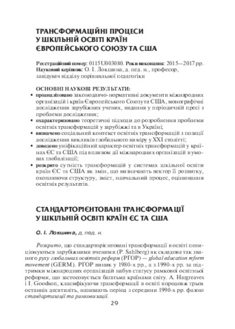 - Локшина, Олена Ігорівна (2016) Standardized Transformations in the EU and the US School Education In: Анотовані результати науково-дослідної роботи Інституту педагогіки НАПН України за 2016 рік . Педагогічна думка, м. Київ, Україна, pp. 29-30.