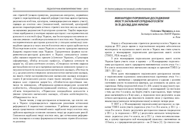 - Науменко, С.О. (orcid.org/0000-0002-8279-4427) (2015) The international comparative studies of the quality of general secondary education and their experience for Ukraine In: Педагогічна компаративістика – 2015: трансформації в освіті зарубіжжя та український контекст : матеріали наук.-практ. семінару (Київ, 11 червня 2015 р.) . Педагогічна думка, м. Київ, Україна, pp. 71-74.