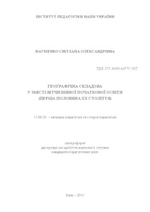 The dissertation for the candidate degree of pedagogical sciences in specialty 13.00.01 – The General Pedagogy and the History of Pedagogy. – Institute of Pedagogy of the National Academy of Pedagogical Sciences of Ukraine, Kyiv, 2011. In this dissertation was accomplished the complex historical and pedagogical analysis research as to development of geographical constituent in the content of domestic primary education in the first part of XX century. The content of educational plans, programs, and textbooks, educational and methodical manuals of geographical and natural history for primary chain of education in 1900–1948 was analyzed as well pedagogical history works. The four periods were outlined in developing of the geographical constituent of domestic primary education content in the first part of XX century: I period (1900–1917) – developing of the geographical content in primary education on Ukrainian lands in the conditions of struggling for creation of national school; II period (1917–1920) – building of the geographical constituent in the content of domestic primary education in Ukraine in the conditions of establishing of the national system of education; III period (1919–1931) – developing of the geographical content of primary education in Ukrainian Socialistic Soviet Republic under conditions of school educational experiments and innovations; IV period (1931–1948) – reformation of the geographical constituent in the content of primary education in Ukrainian Soviet Socialistic Republic under conditions of establishing of Soviet school. The factors which had influence on geographical content of primary education were pointed out in each outlined period. The directions of applying of the positive aspects of the geographical constituent development in the content of the national primary education in the first half of the twentieth century for the modern reform of primary-level education were determined.
