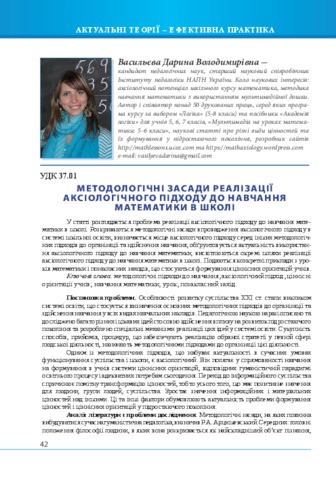 - Васильєва, Д.В. (orcid.org/0000-0002-4083-681X) (2016) Methodological principles of axiological approach realization in studying mathematics at school Український педагогічний журнал, 2. pp. 42-49.