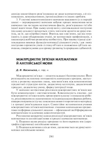 - Васильєва, Д.В. (orcid.org/0000-0002-4083-681X) (2015) Interdisciplinary relations of mathematics and English In: Анотовані результати науково-дослідної роботи Інституту педагогіки НАПН України за 2015 рік . Педагогічна думка, м. Київ, Україна, pp. 241-242. ISBN 978-966-644-398-5