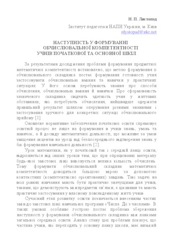 - Листопад, Наталія Петрівна (2016) The continuity in formation of calculation competency from lover to middle school In: Реалізація наступності в математичній освіті: реалії та перспективи: збірник наукових праць за матеріалами Всеукраїнської науково-практичної конференції, 15 - 16 вересня 2016 року, м. Одеса . Ранок, м. Харків, Україна, pp. 29-30. ISBN 978-617-09-0152-1