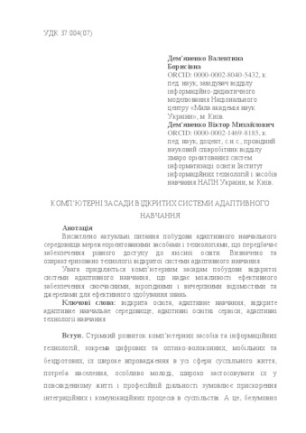 - Дем’яненко, В.М. (orcid.org/0000-0002-1469-8185) and Дем’яненко, В.Б. (orcid.org/0000-0002-8040-5432) (2018) Computer basics open system adaptive learning Адаптивне управління: теорія і практика. Педагогіка, 4 (7). ISSN 2707-0255