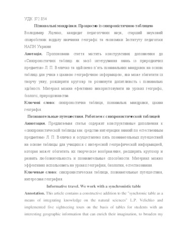 - Яценко, Володимир Сергійович (orcid.org/0000-0002-7948-2983) (2017) Informative travel. We work with a synchronistic table Географія та економіка в рідній школі, 6 (184). pp. 30-33.