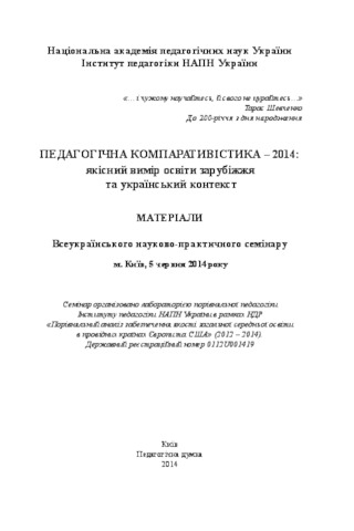 The materials of the collection are devoted to the issues discussed at the scientific and practical seminar "Pedagogical Comparative Studies - 2014" (Kiev, June 5, 2014): methodological benchmarks for comparative and pedagogical studies, strategies for the development of school, vocational education and adult education in comparative the prospect of foreign experience in supporting talent and promoting pupils' creative abilities, innovative technologies in education abroad and Ukraine. For developers of educational policy, scholars, managers, graduates, postgraduates, students. The authors of the published materials are responsible for the accuracy of the above facts, quotes, their own names, references to sources and other information.