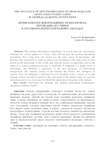 - Kondratenko, Larysa (orcid.org/0000-0001-7271-7439) and Manylova, Lidiya (orcid.org/0000-0002-0300-3827) (2018) The influence of new information technologies for motivation to education in general learning іnstitutions Innovation and technology information in education. pp. 287-294. ISSN ISBN 978–83–947093–8–9