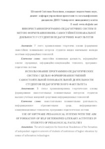 - Штангей, С. В. (2018) Use of software-pedagogical systems with the aim of formation of self-determined literary activities in students of pedagogical faculties In: Інноваційні технології навчання обдарованої молоді. Матеріали Х міжнародної науково-практичної конференції . Інститут обдарованої дитини НАПН України, м. Київ, Україна, pp. 252-260.