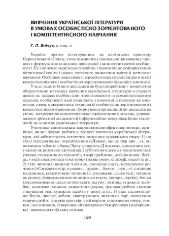 - Бійчук, Галина Леонідівна (orcid.org/0000-0001-5699-687X) (2016) Study of Ukrainian literature in the conditions of personally oriented and competent study In: Анотовані результати науково-дослідної роботи Інституту педагогіки НАПН України за 2016 рік . Педагогічна думка, м. Київ, Україна, pp. 168-169. ISBN 978-966-644-398-5