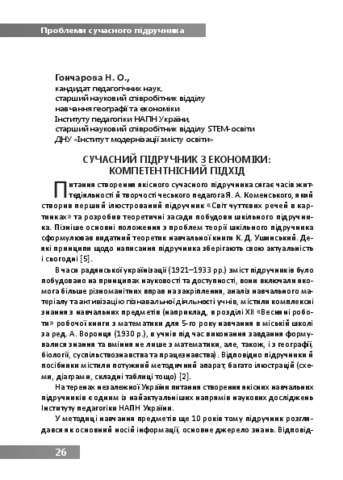 - Гончарова, Наталія Олександрівна (orcid.org/0000-0002-2120-4542) (2018) Modern textbook on economics: a competent approach In: Проблеми сучасного підручника: матеріали міжнародної науково- практичної конференції, 18–19 травня 2018 р., м. Мінськ, Республіка Білорусь . Педагогічна думка, м. Київ, Україна, pp. 26-29. ISBN 978-966-644-469-4