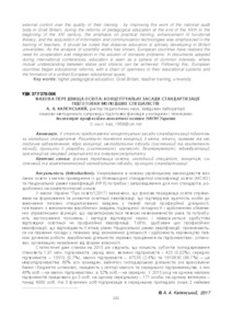 Abstract. The article presents conceptual bases of standardization of training of junior specialists. The concept is analyzed, its purpose, stages, legal and methodological support, the core of the concept, methodological approaches (systemic and competent), the principles of its development (systemic, flexibility, continuity, individualization, orientation to the end result) and expected results.