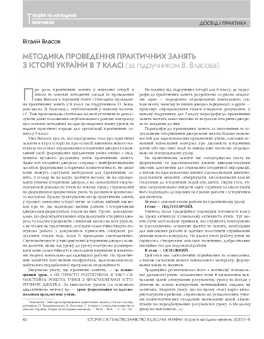 - Власов, Віталій Сергійович (2015) Methodology of practical classes on the history of Ukraine in the 7th form Історія і суспільствознавство в школах України: теорія та методика навчання, 7-8. pp. 40-47.