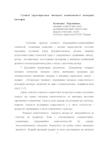 - Мартиненко, Валентина Олександрівна (2013) Essential characteristics of readership competence of junior pupils Початкова школа, 12 (534). pp. 3-7. ISSN 0131-5358