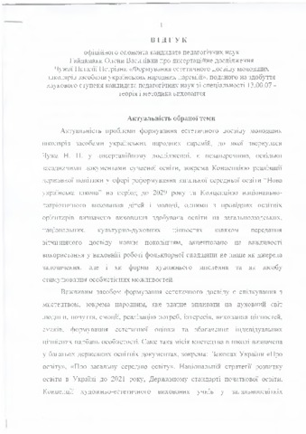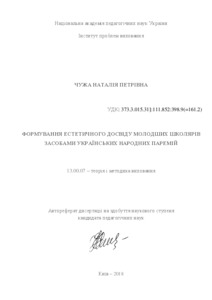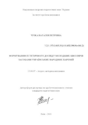 Dissertation for the scientific degree of Candidate of Educational Sciences in speciality 13.00.07 – Theory and Methods of Education. – Institute of Problems on Education of the National Academy of Educational Sciences of Ukraine. – Kyiv, 2018. The dissertation deals with the relevant topic of the aesthetic experience formation in younger schoolchildren using Ukrainian folk paroemias. Based on the philosophical, psychological and pedagogical sources analysis the status of the issue under research is determined and the essence of “aesthetic experience in younger schoolchildren” is clarified as an internally adopted, integrated continuum of activity and creative development of reality. The structural components of the aesthetic experience include aesthetic knowledge, emotions and feelings, interests, tastes, ideals. It is determined that the junior school age is the most favourable for formation of aesthetic experience due to such psychological features as: a gradual transition from syncretism of thoughts, feelings to a differential perception of reality, cognitive activity, sensitivity to beauty, imaginative thinking, empathy, a tendency to aesthetic perception of the real objects, creative abilities development. The dissertation analyses the potential of the Ukrainian folk paroemias in forming the aesthetic experience of junior pupils. It is noted that proverbs, sayings and riddles have a significant influence on the emotional and sensual sphere of personality: they contribute to the formation of aesthetic feelings, value orientations, empathy, stimulate associative thinking and imagination, develop creative abilities, retain information about life, world outlook, spirituality, history of the people. Based on the psychological and pedagogical literature analysis, the structural components of aesthetic experience are identified, among which: cognitive (understanding by younger schoolchildren of aesthetic value of the environment and works of art); emotional value-based (includes aesthetic feelings and evaluation, developed empathy); praxis (the ability to interpret own emotions and feelings, practical and creative updating of the acquired experience).