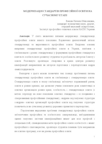 - Ваніна, Н.М. (2018) Modernization of professional education standards at the present stage Вісник Глухівського національного педагогічного університету імені Олександра Довженка. Педагогічні науки, 2 (37). pp. 52-60. ISSN 2410-0897
