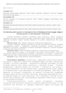 - Остапенко, Ірина Віталіївна (orcid.org/0000-0001-6710-5964), Соснюк, Олег Петрович (orcid.org/0000-0002-7558-8879), Соснюк, Є. О. and Стіту, Айман (2015) Comparative analysis of specifics of perception of the image of Ukrainian and foreign politicians Актуальні проблеми соціології, психології, педагогіки, 2 (27). pp. 84-90. ISSN 2311-214X